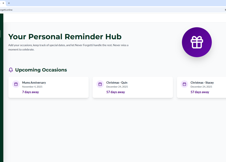 Once you subscribe, you’ll receive a welcome email with a link to the Never Forgetti Reminder Hub. Simply sign in and enter your occasion details — it’s quick and easy. Need help navigating the portal? Just follow the steps below.