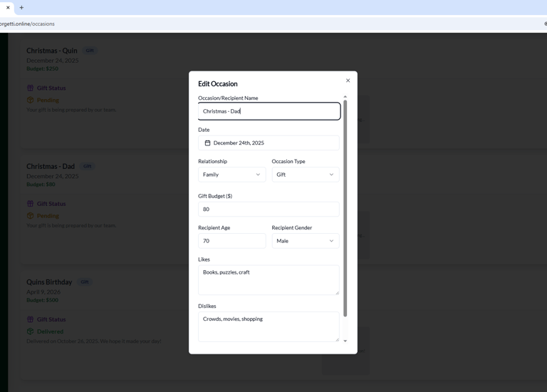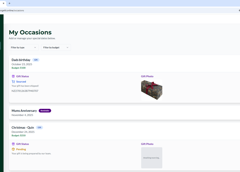 In the "My Occasions" tab, you’ll see the status of each occasion — whether it’s pending, your gift has been sourced, shipped, or delivered.