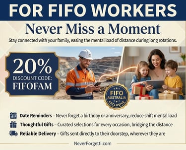 At Never Forgetti, we help bridge that gap. Our service is designed to keep families feeling close, appreciated, and emotionally supported — even when work takes you far from home. With thoughtful gestures delivered on your behalf, your partner and family feel valued, and you stay connected in a meaningful way, no matter the distance.